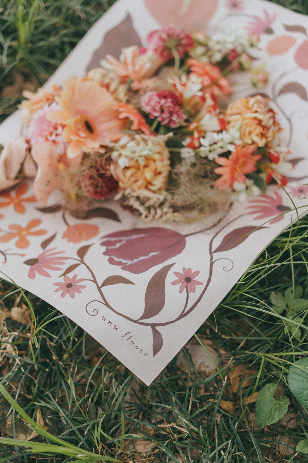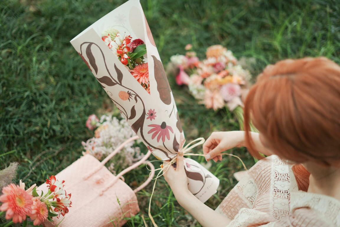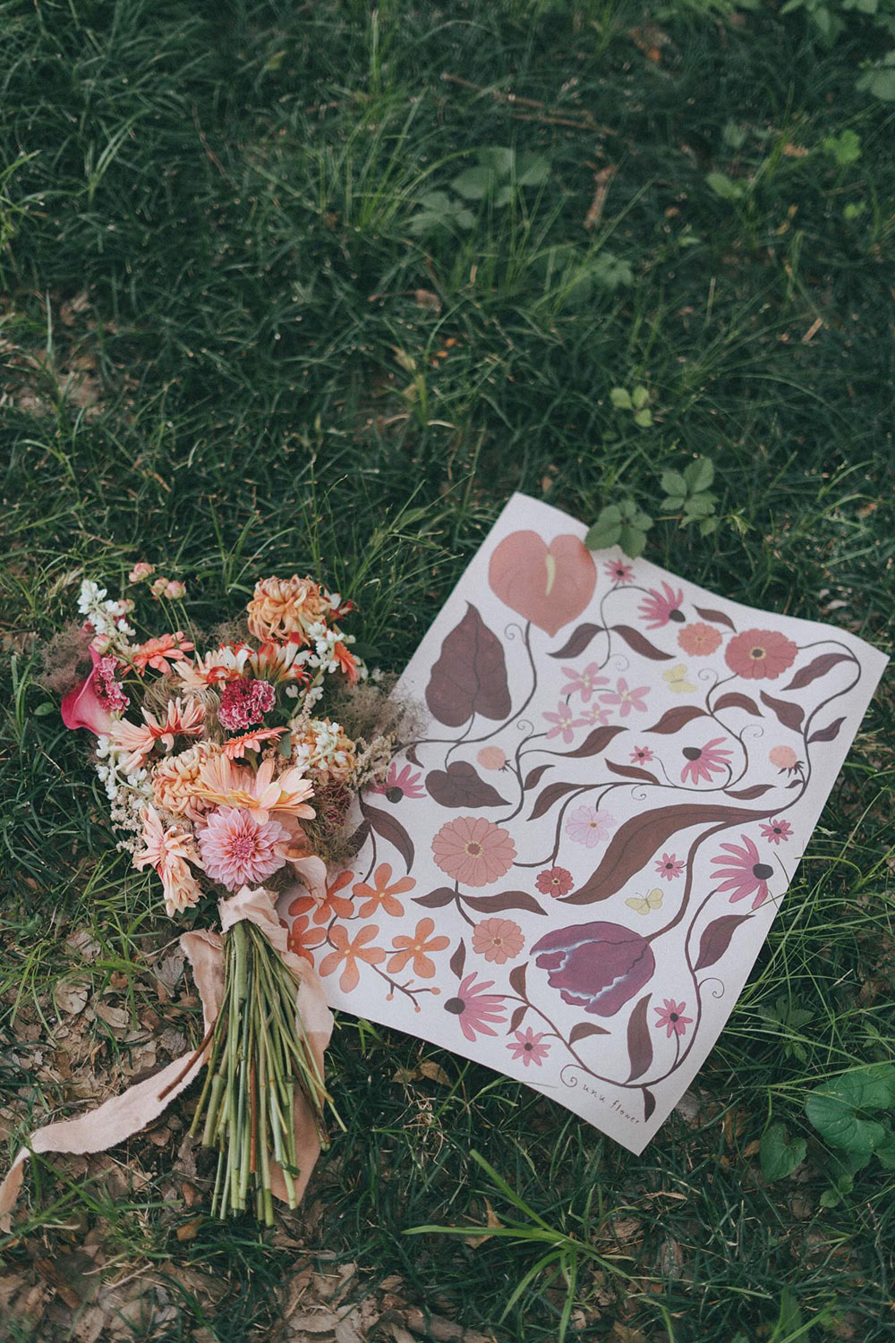 ピンク系の花材をメインに扱うお花屋さんunu flowerのショップカード/SNSアイコン/ラッピングペーパーに使用するイラストレーションを制作いたしました。